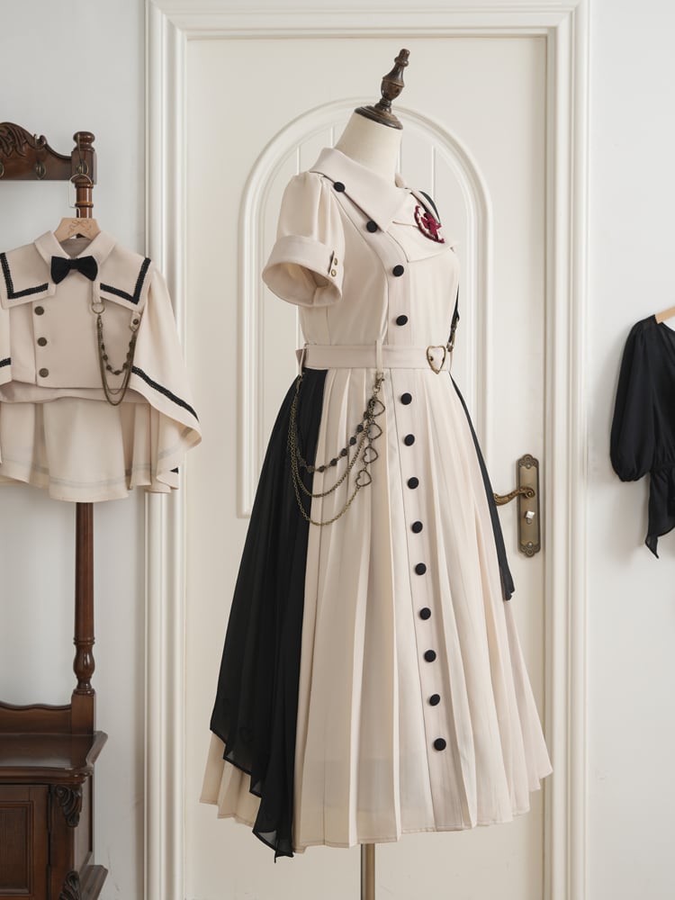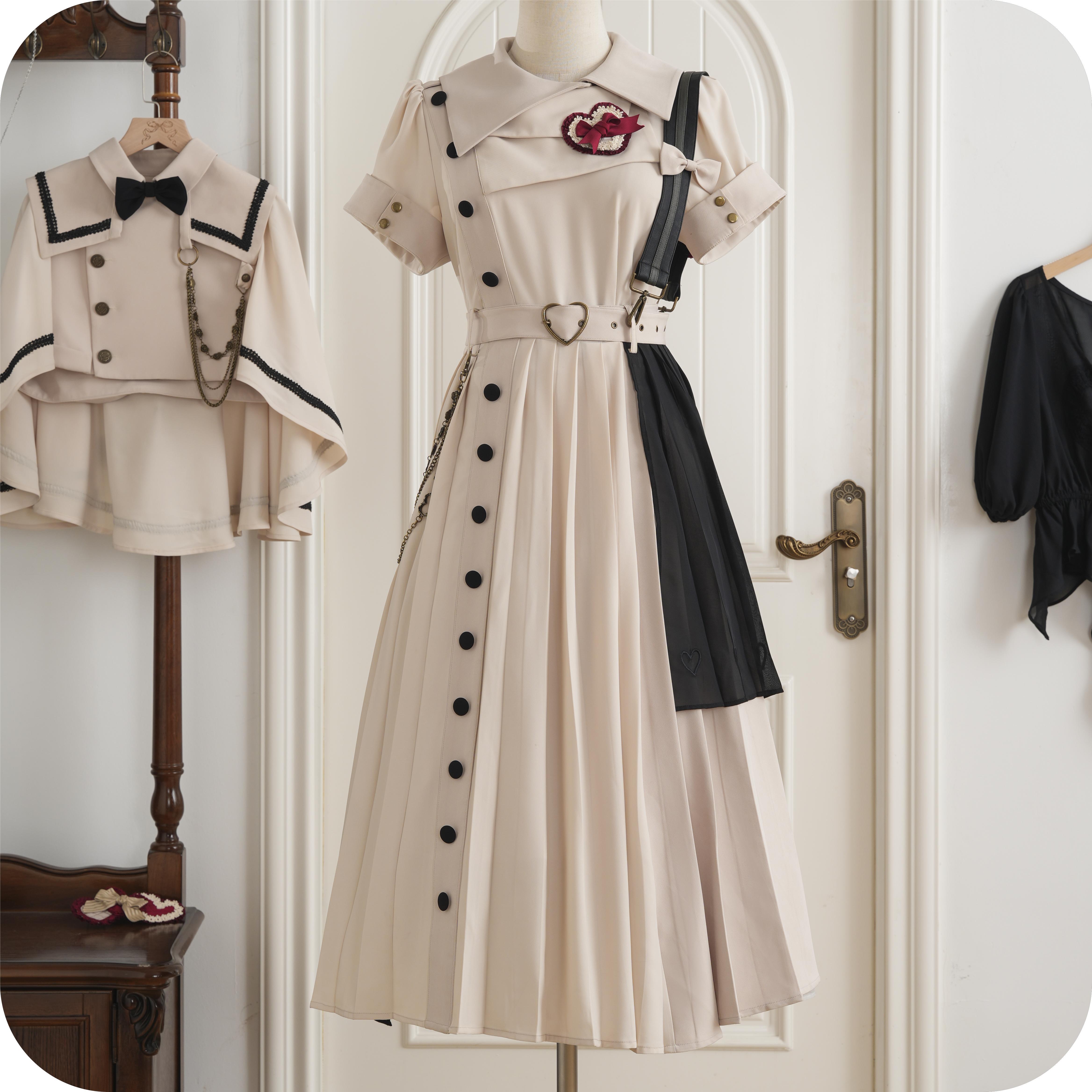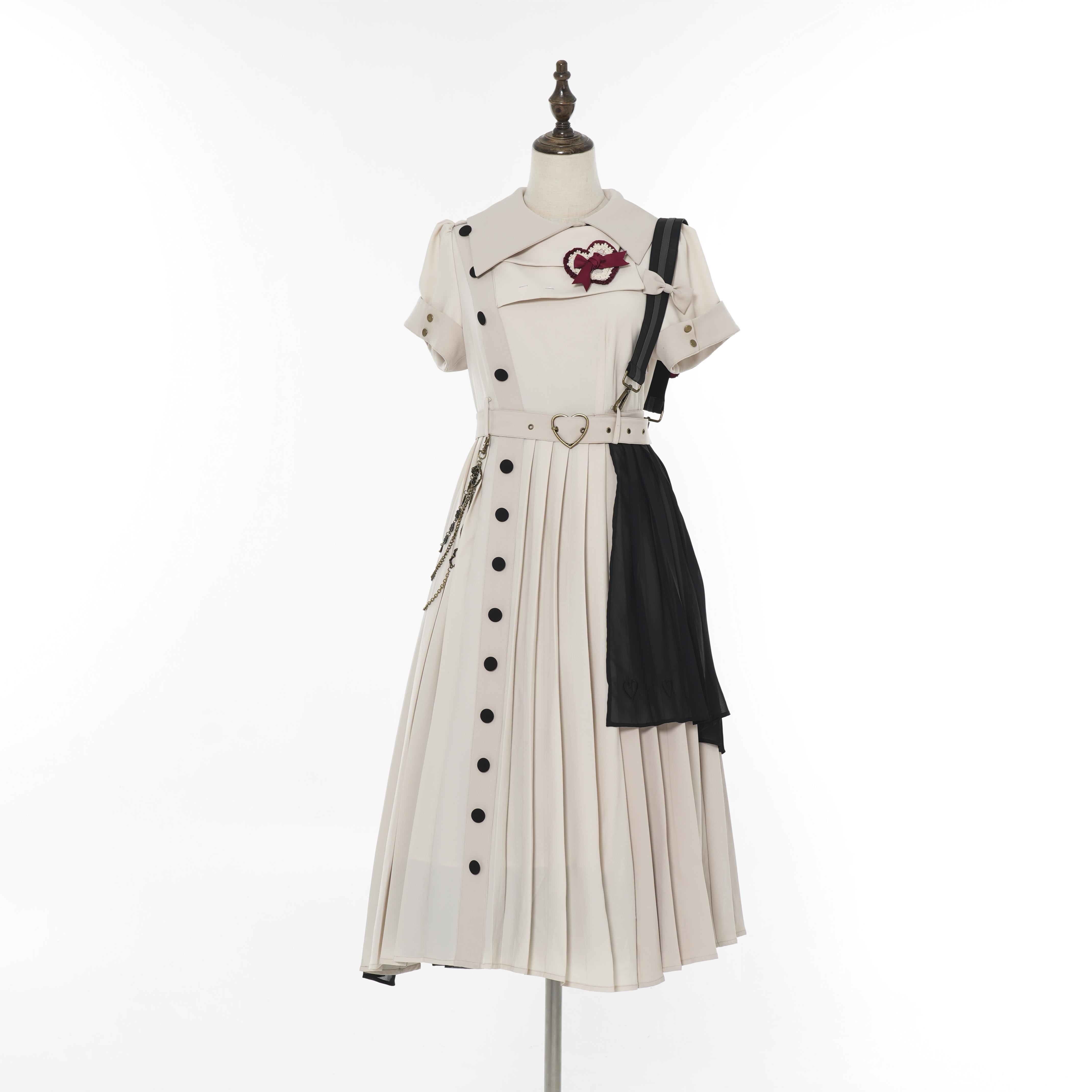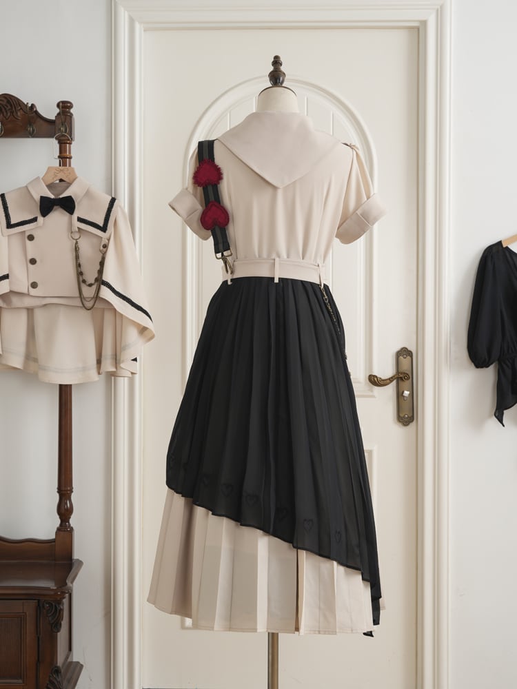 上品に広がる長め丈のプリーツスカートとサスペンダーが大人っぽさを演出。