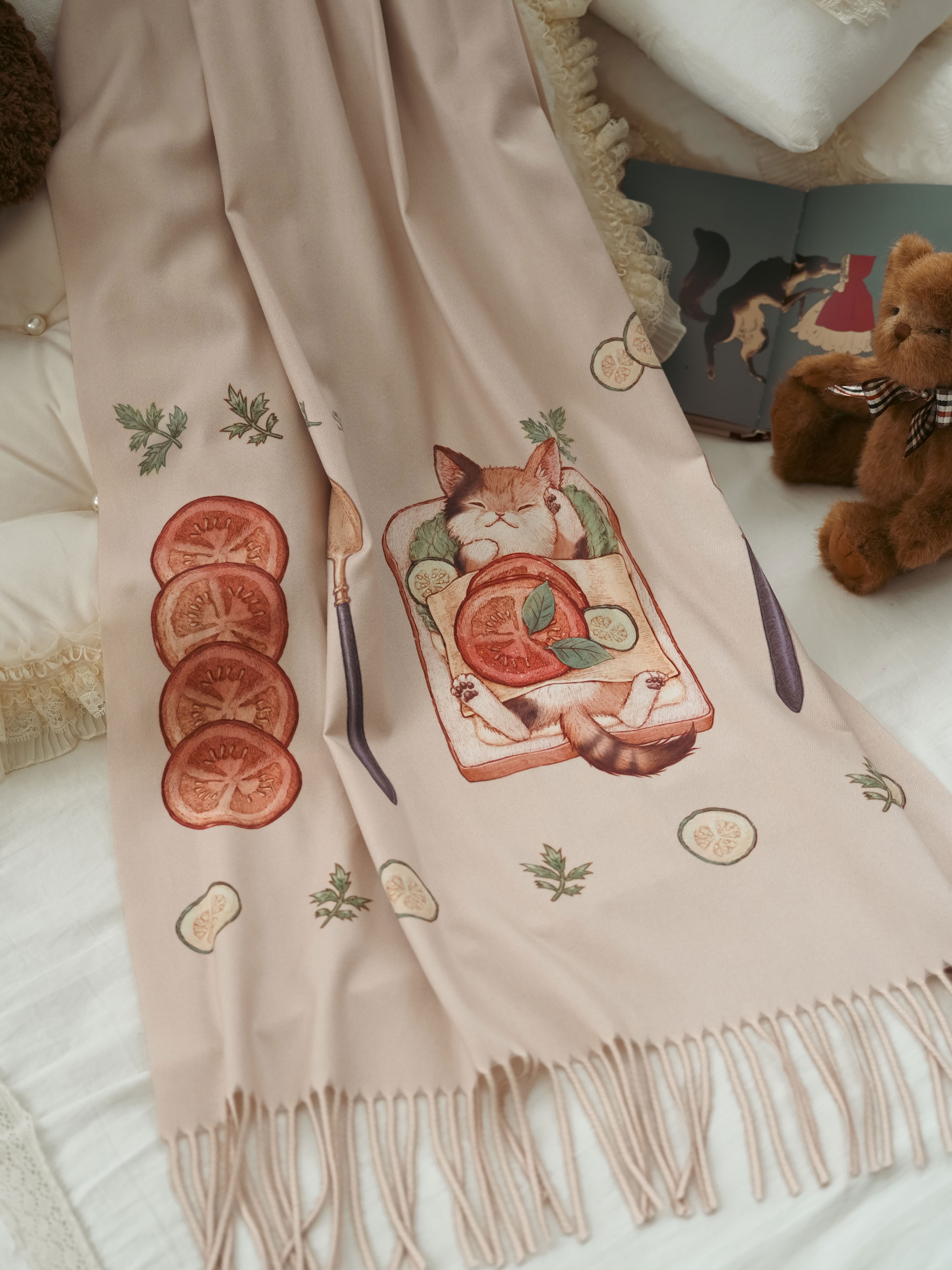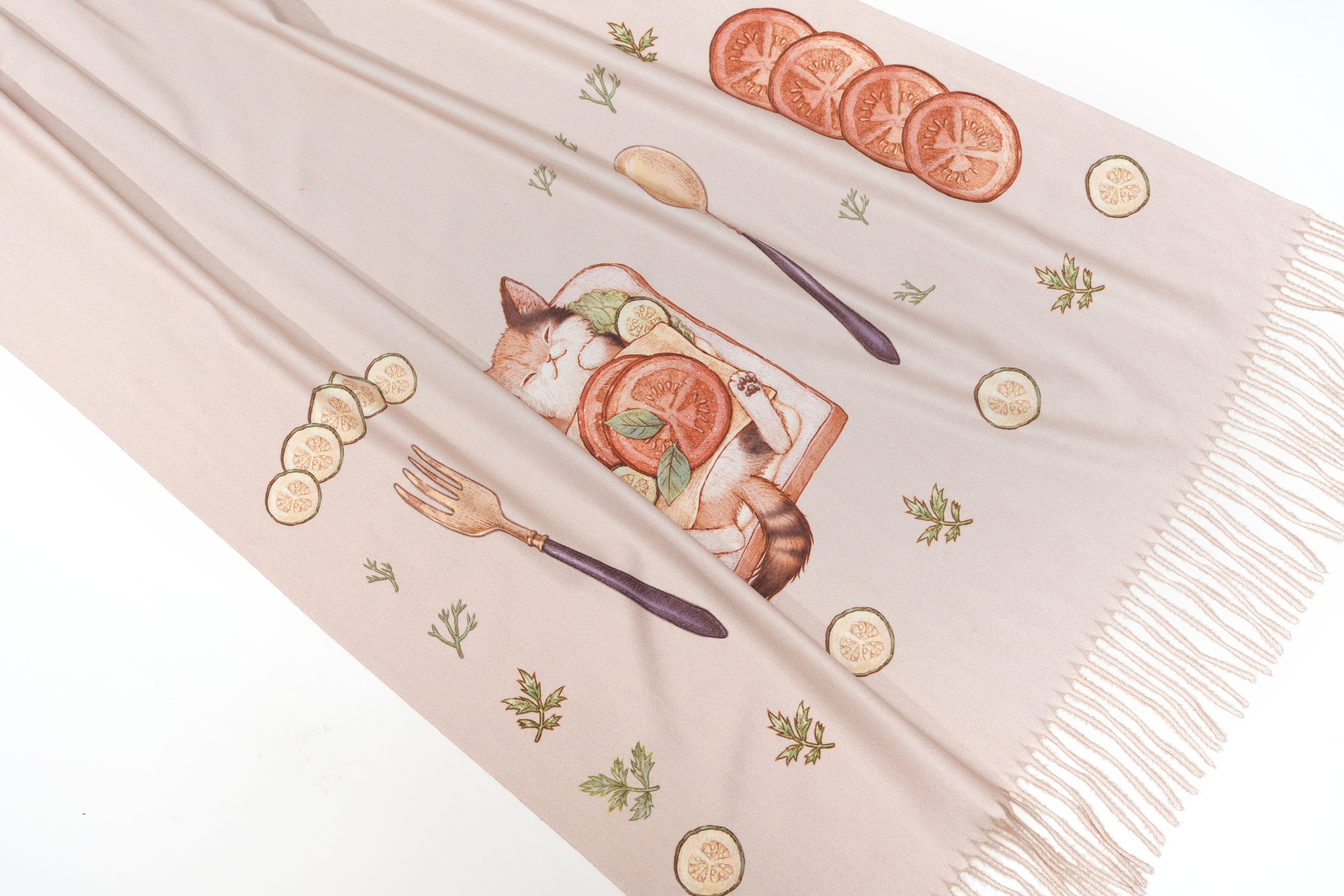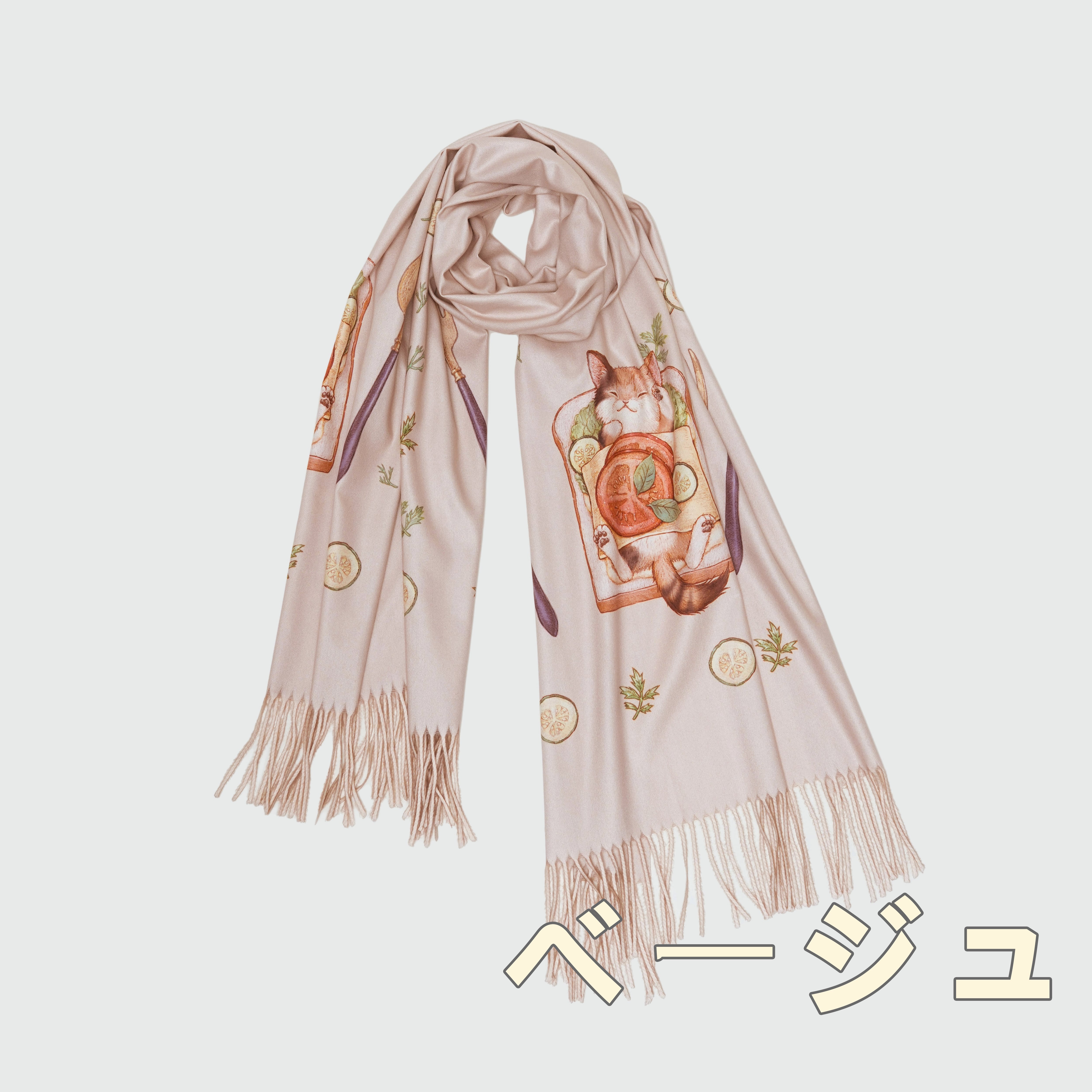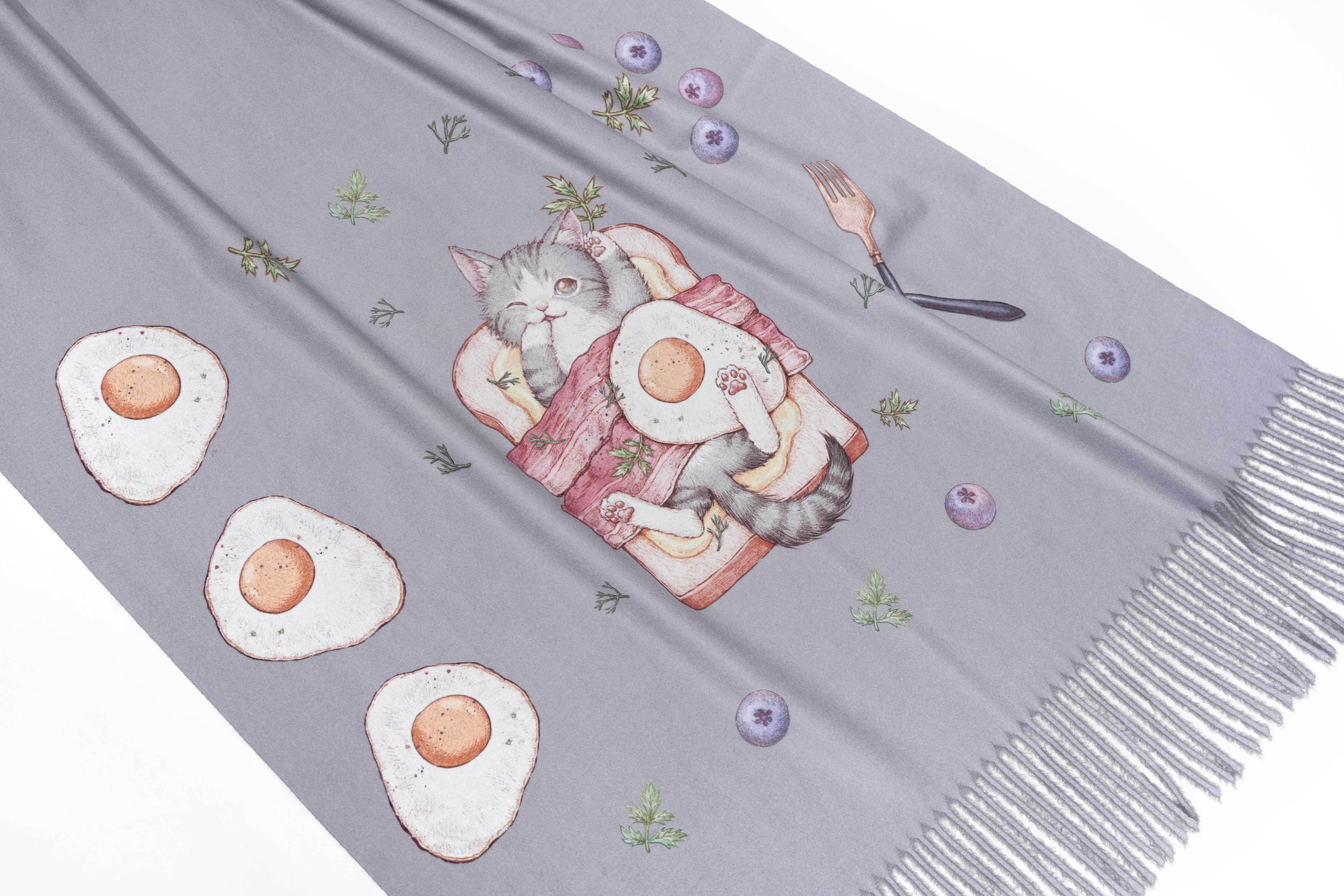 目玉焼きやオレンジに囲まれて幸せそうな猫の温もりを感じる優しいストールです。