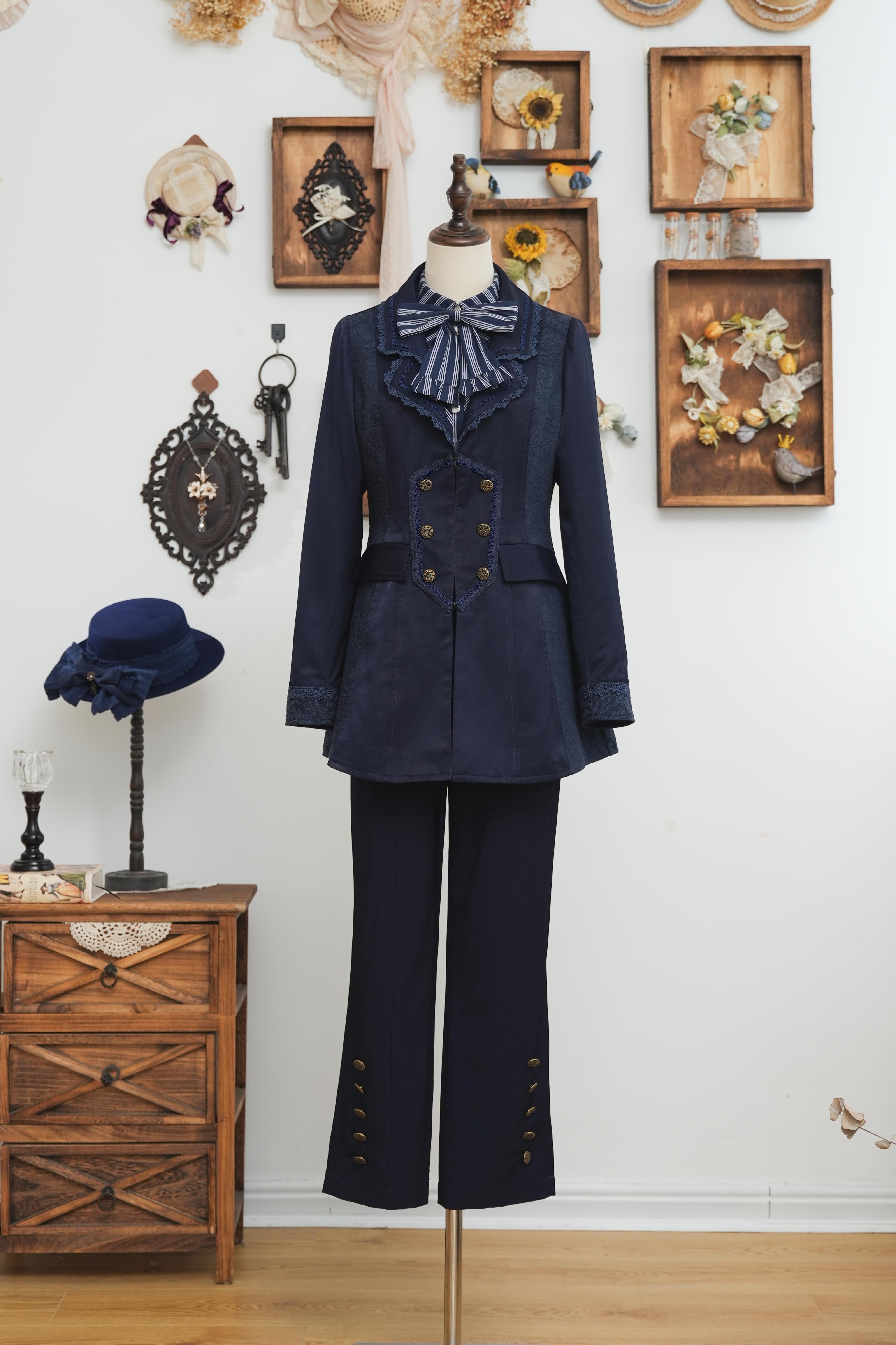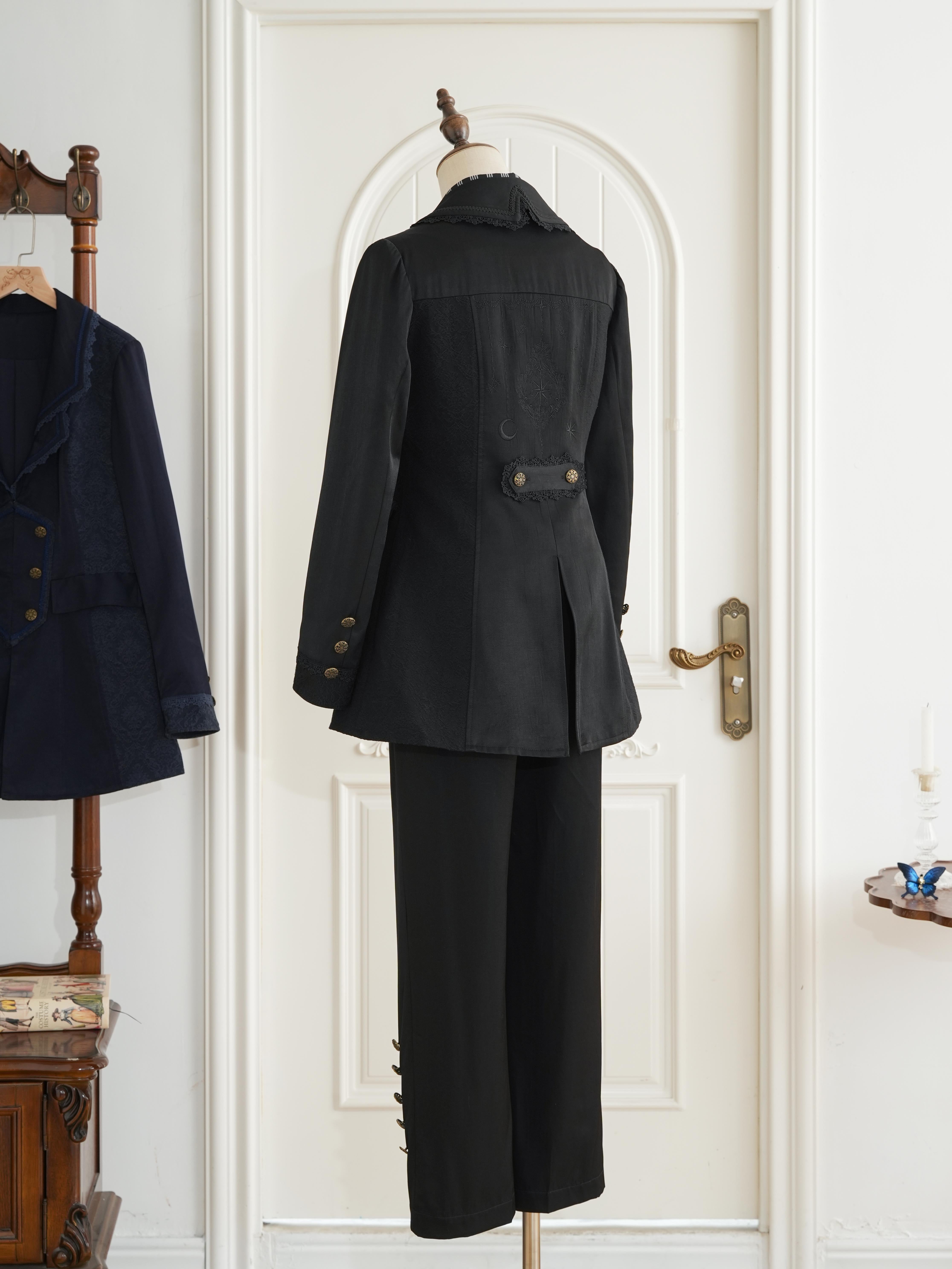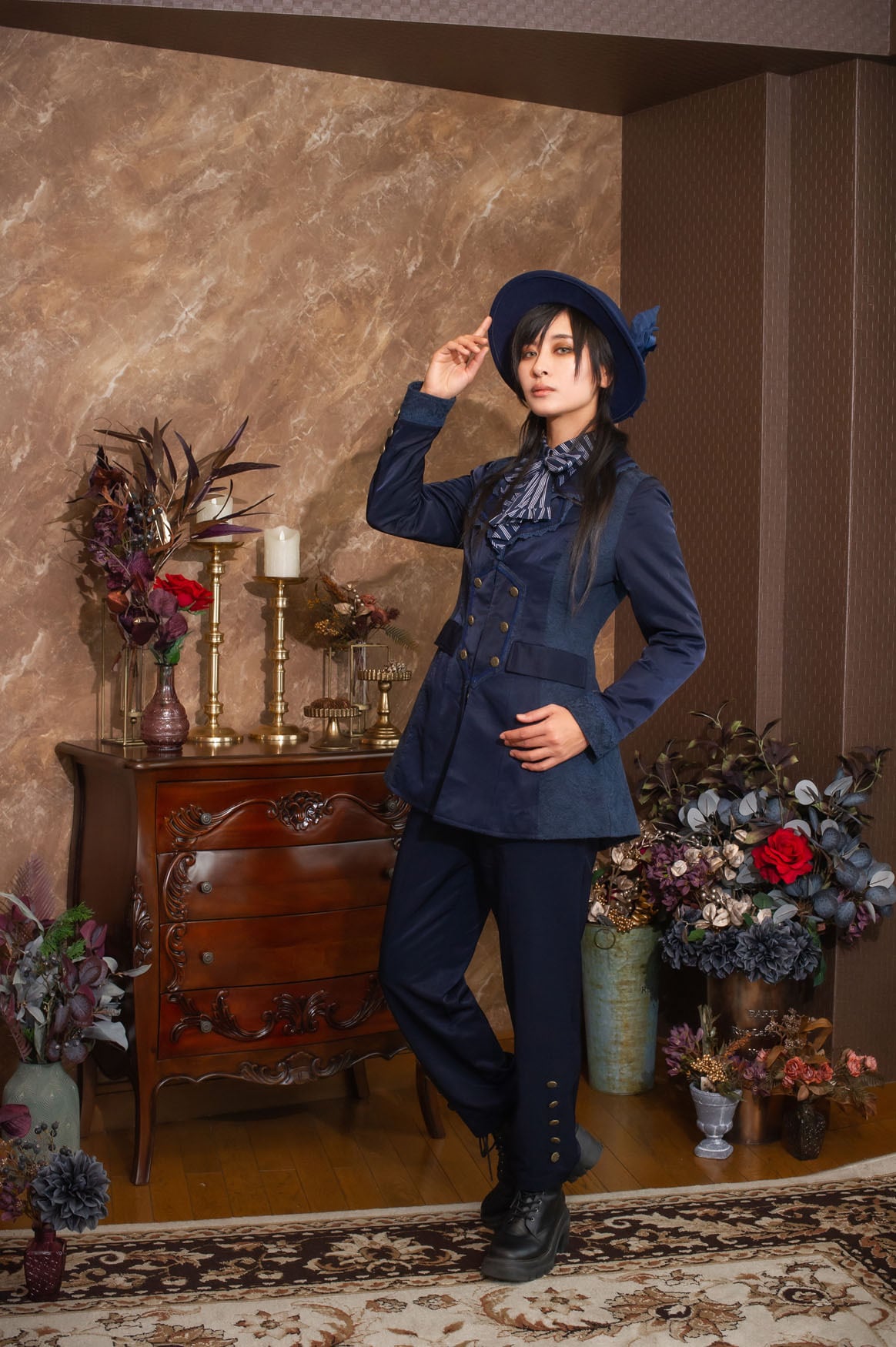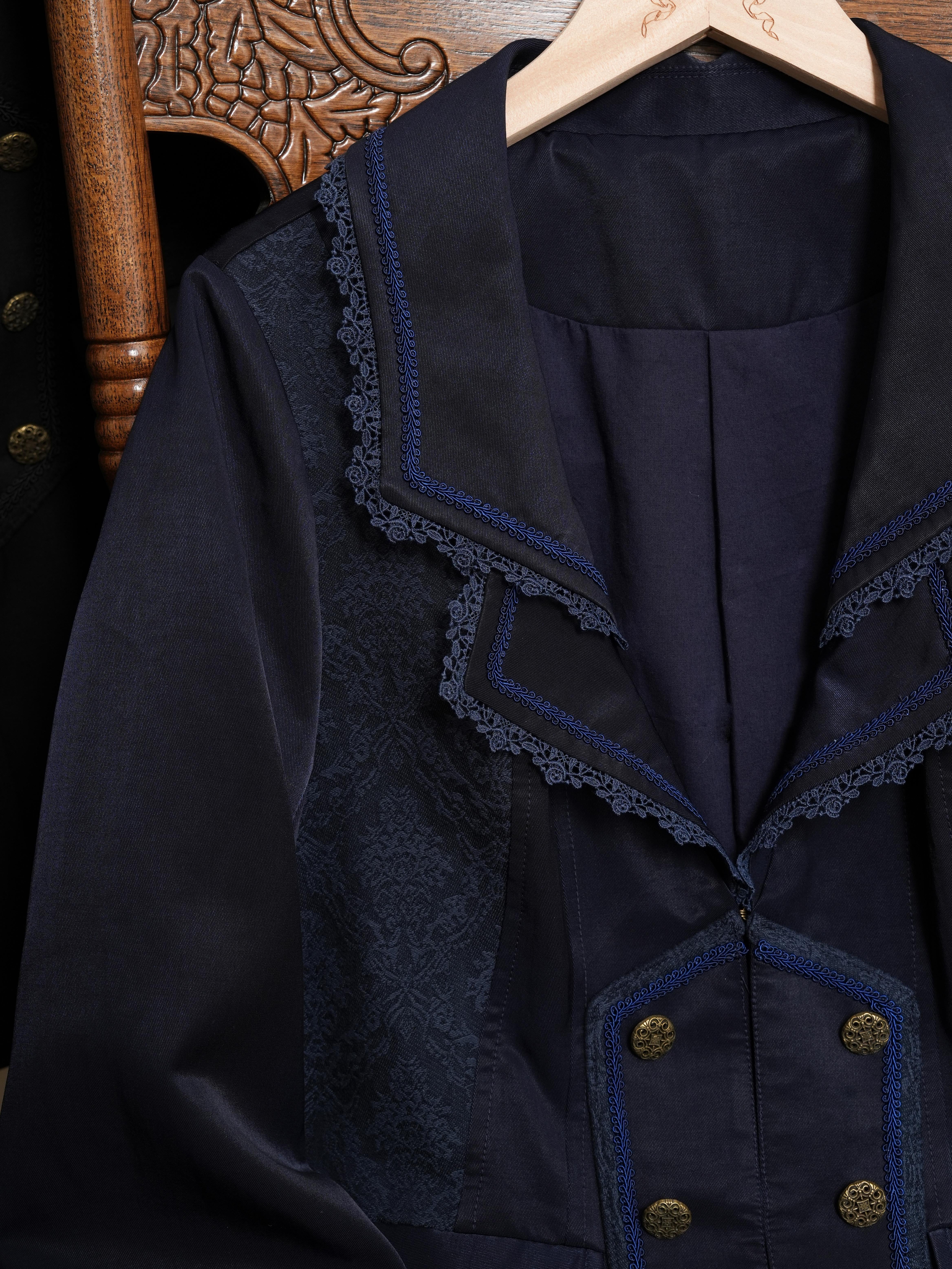 シックなカラーにアンティーク調のダブルボタンが引き立つジャケット。