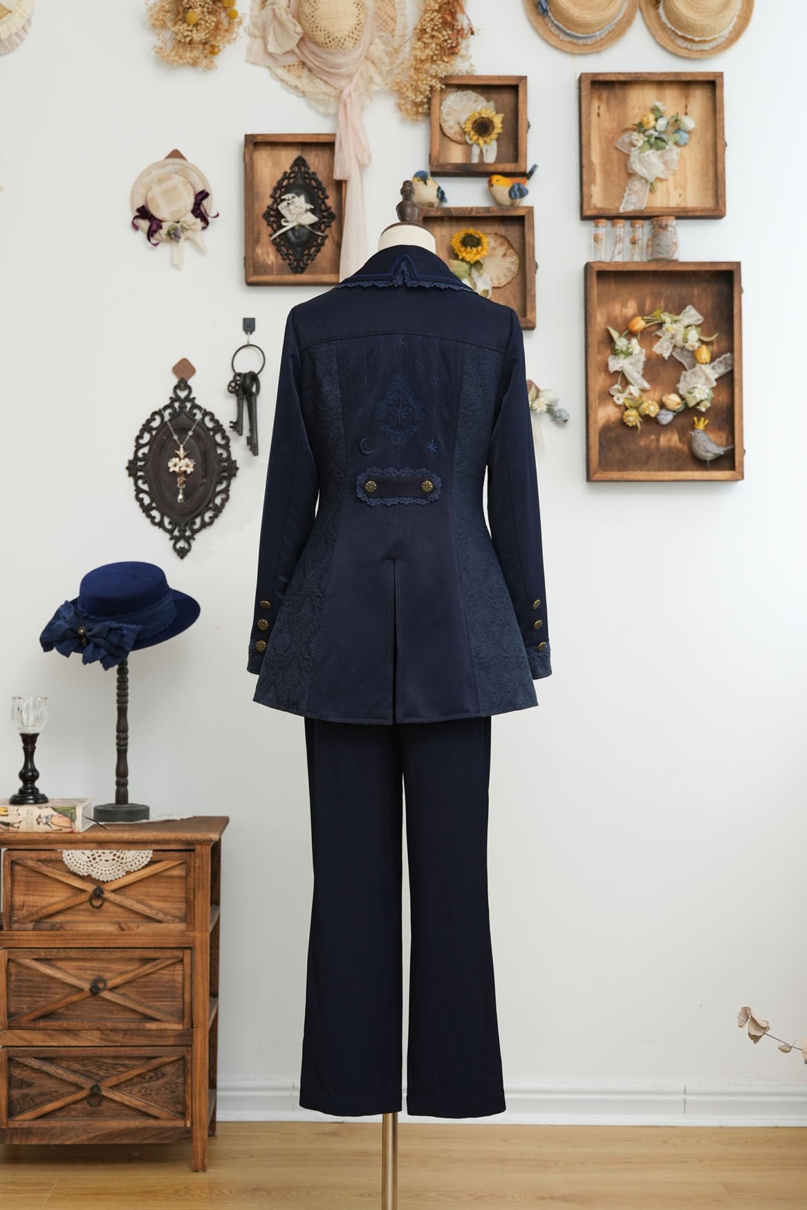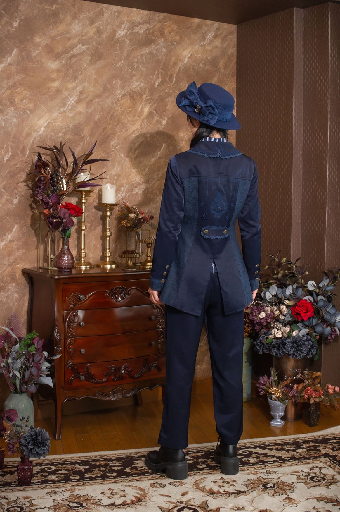 裾に施されたアンティークゴールドのボタンラインが全体をキリっと引き締めます。