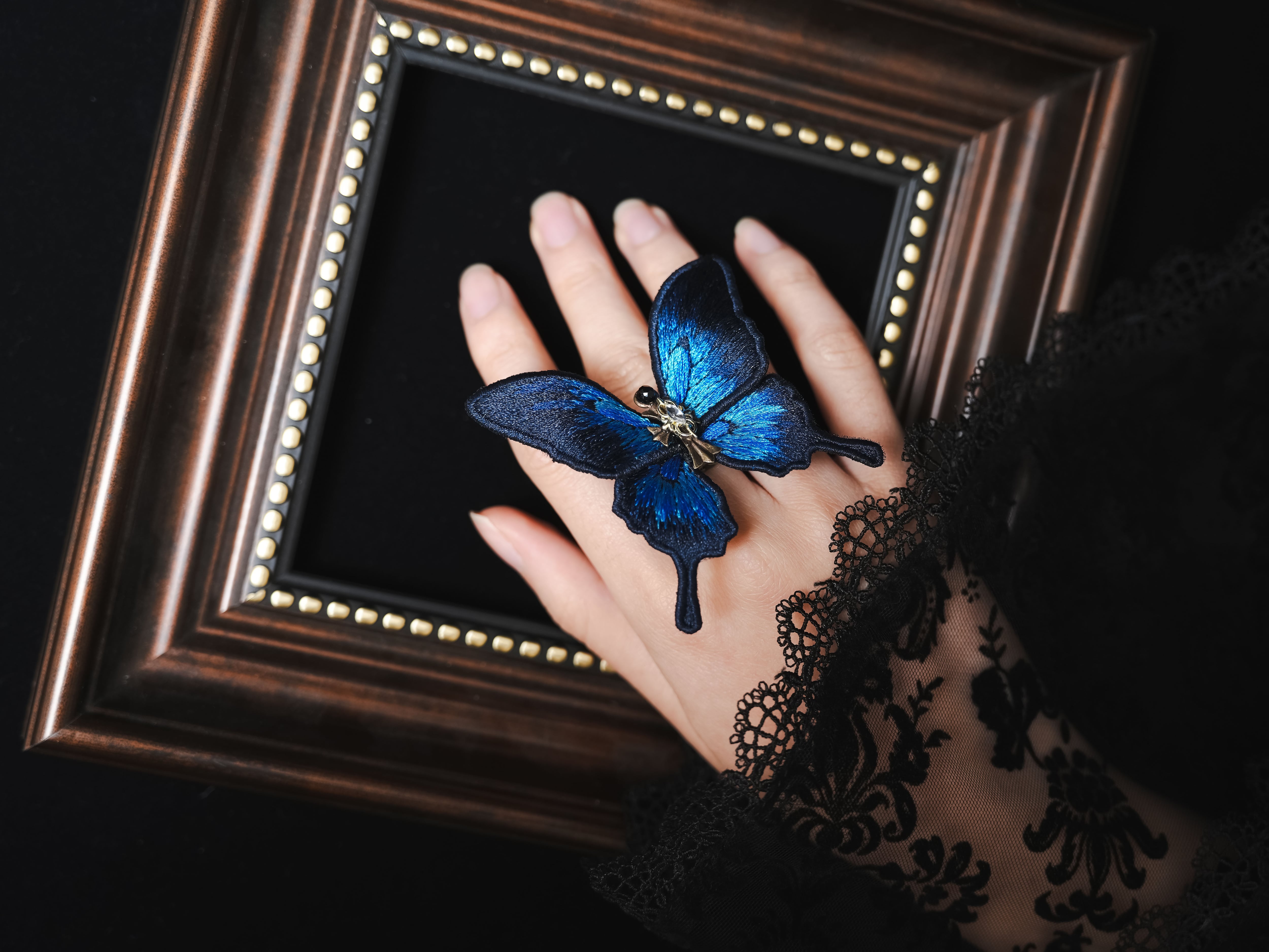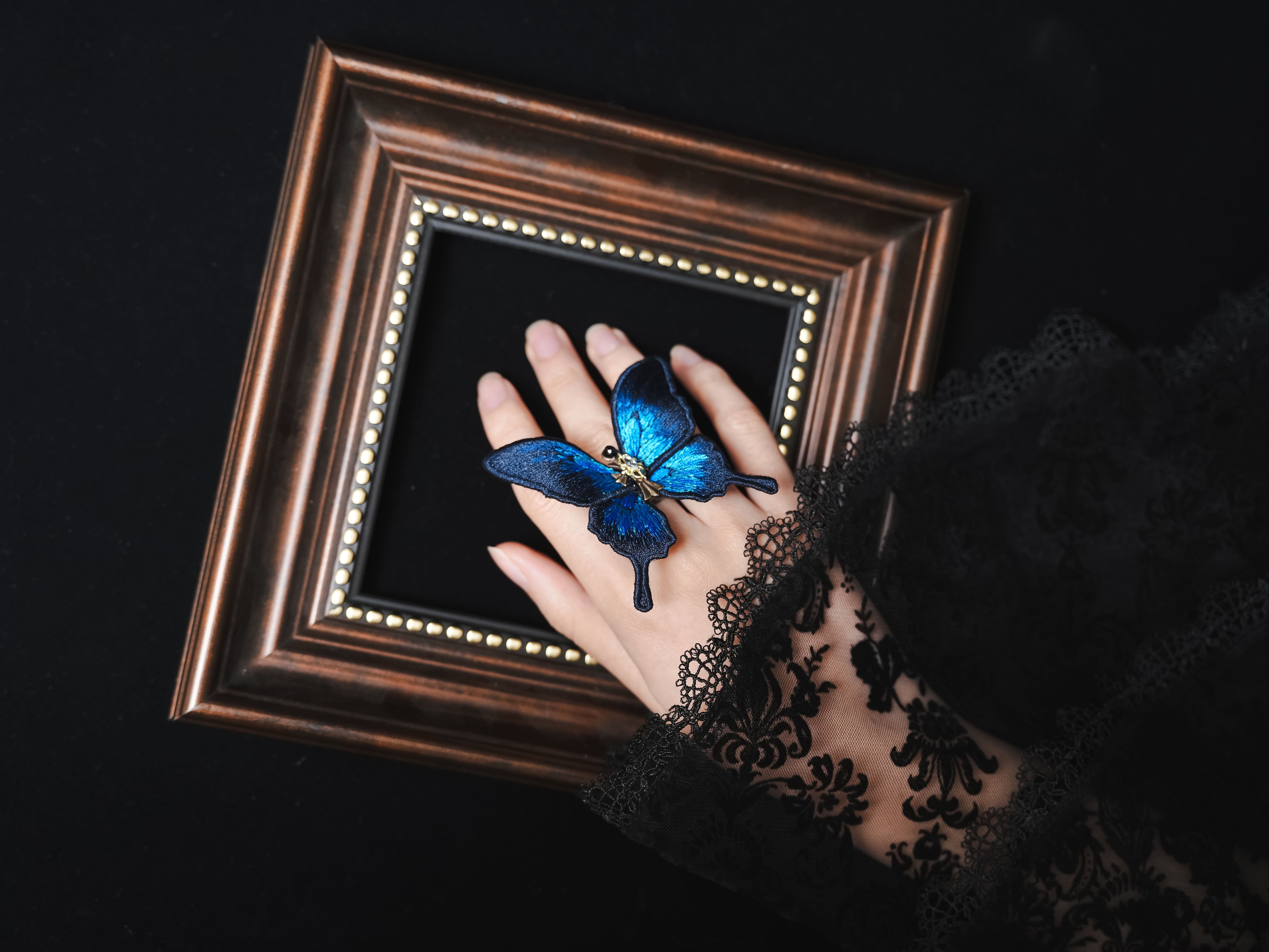 ”美しい瑠璃色の蝶は、ふわりと指先に舞い降り、静かにその鮮やかな翅を休めた”