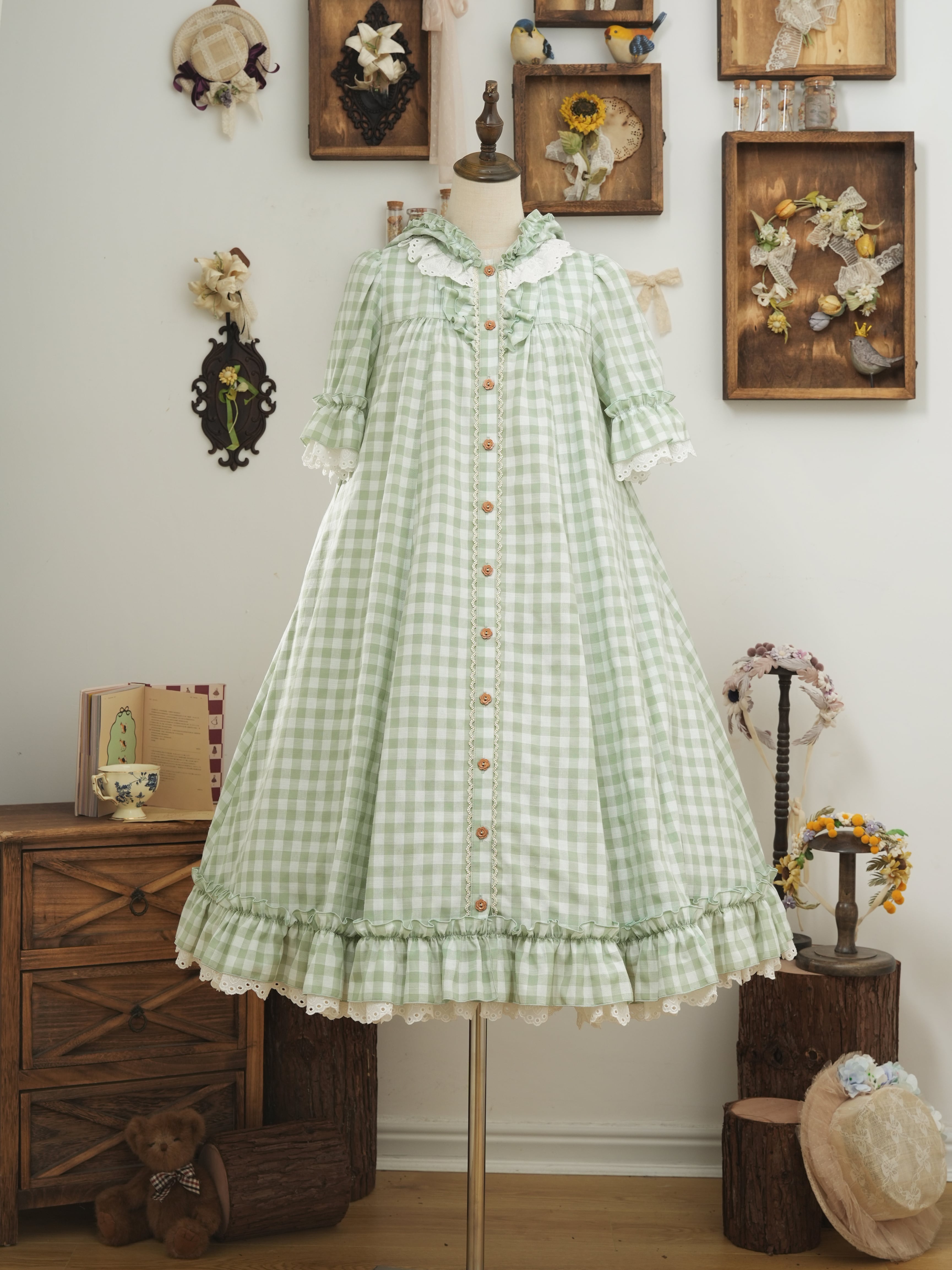 裾や袖周りにたっぷりあしらったコットンフリルと、お花型のウッドボタンが全体のアクセントに。