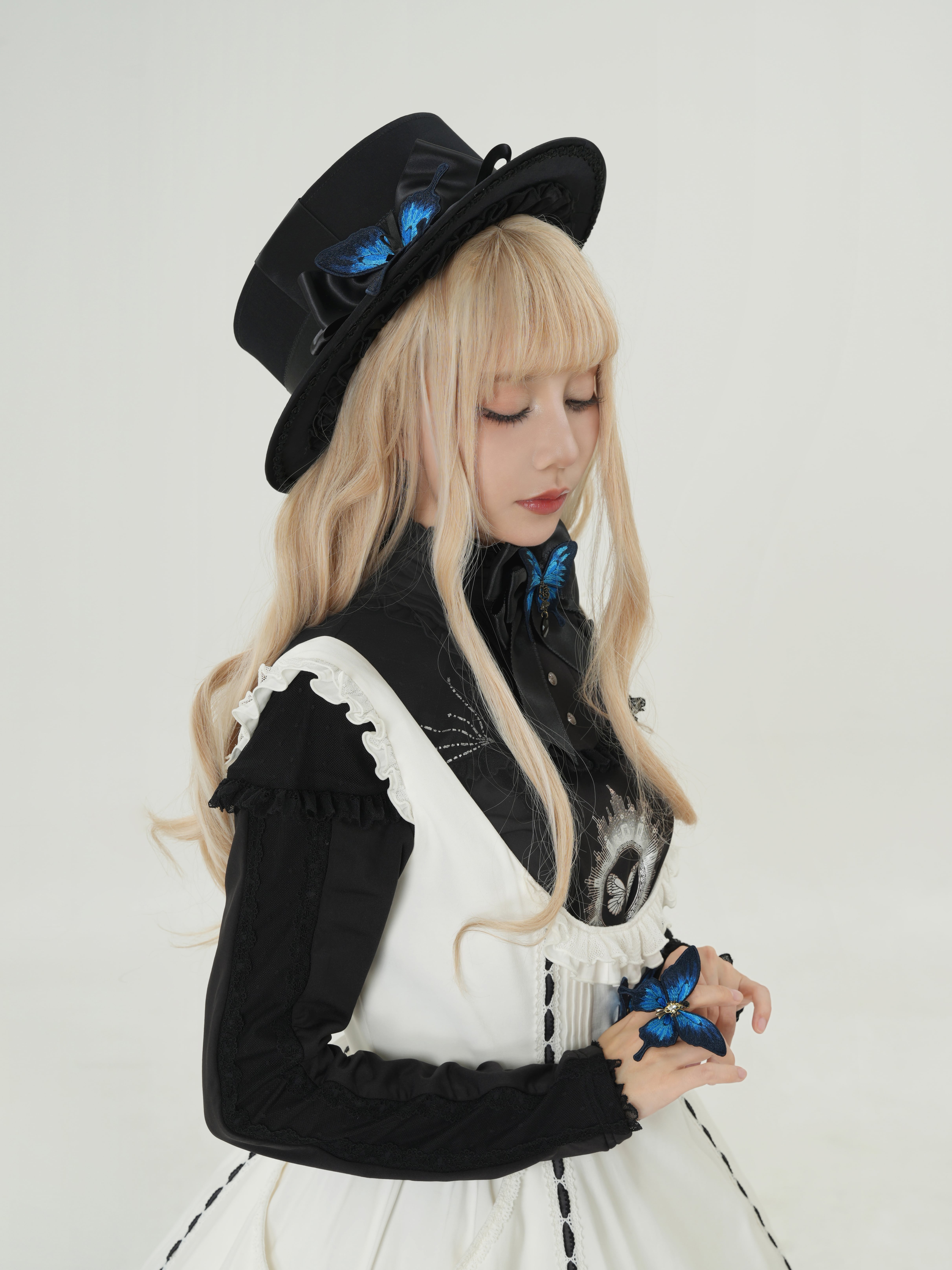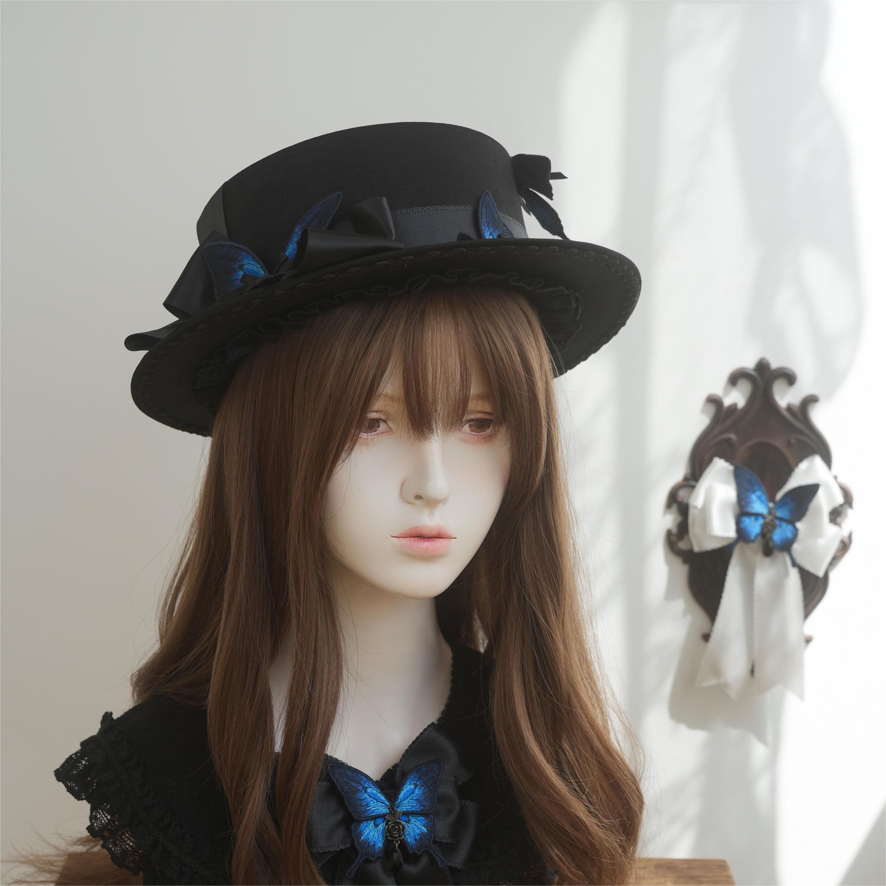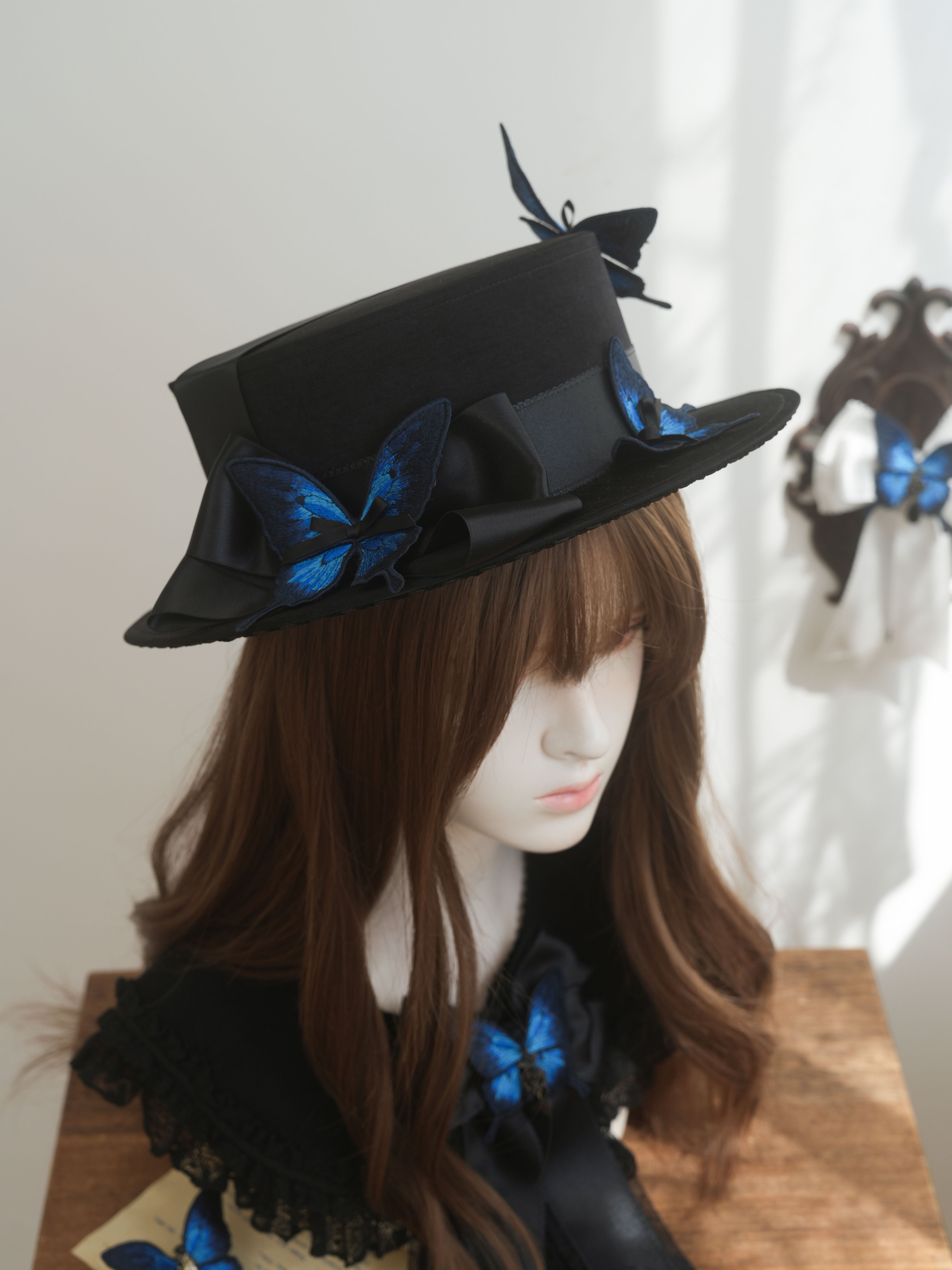 落ち着いた風合いのハットと、しっとりとしたサテンリボン、艶やかな瑠璃色の蝶のコンビネーションがミステリアスな印象を与えます。